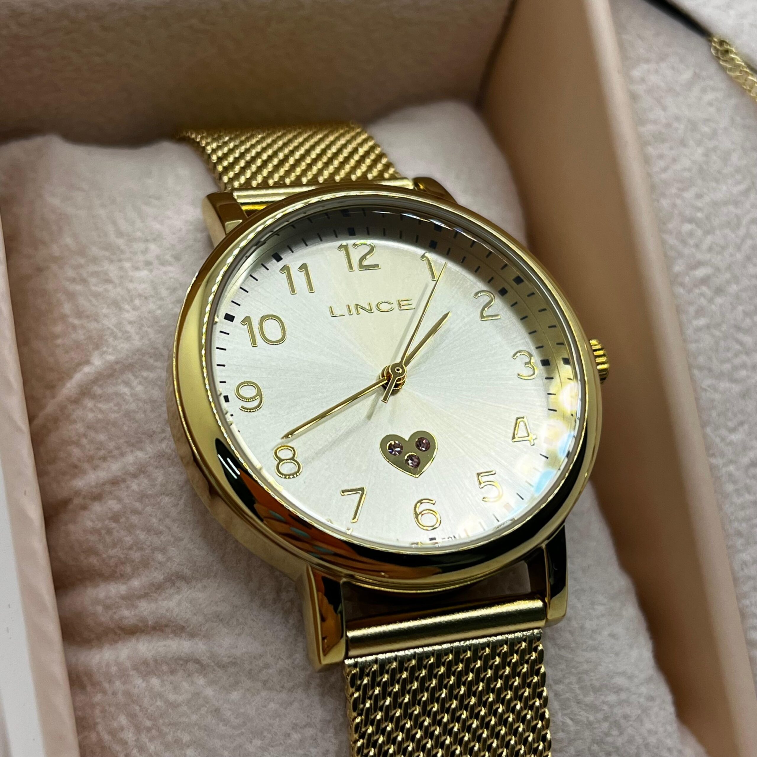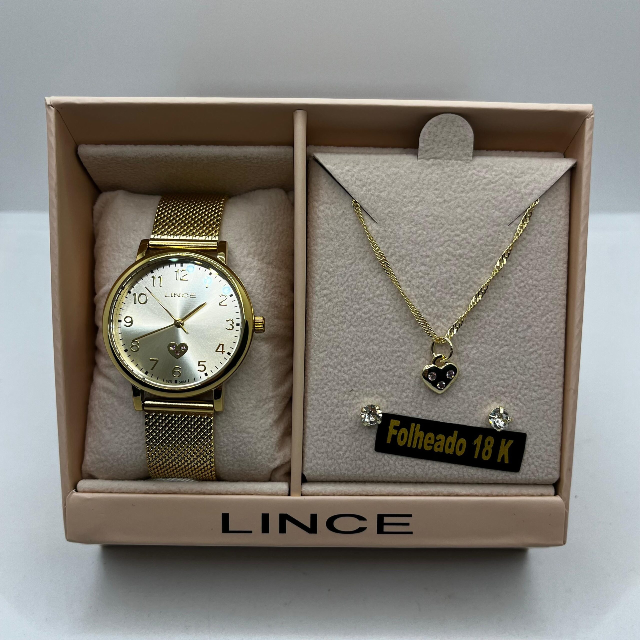 Relógio Lince Dourado ,fundo branco, acompanha Kit de conjunto folhado.
